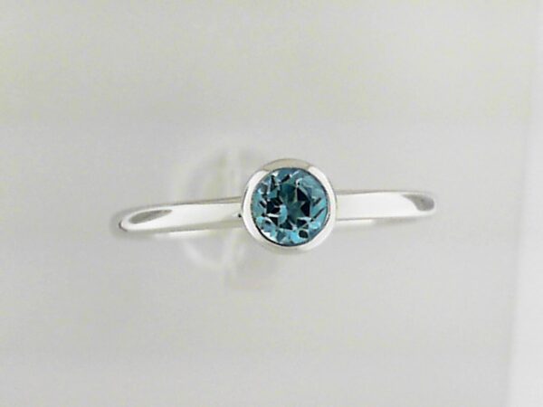 Elevate your style with this stunning 10K white gold ring featuring a 4mm round blue topaz stone in a classic bezel setting. A timeless piece that adds a touch of elegance to any outfit.
