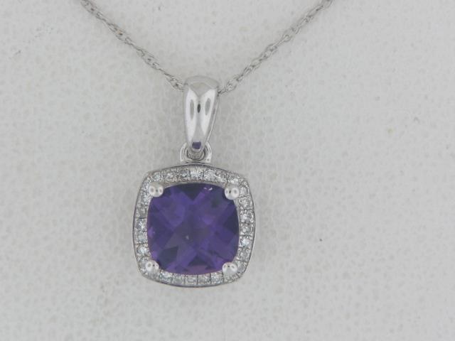 Elevate your style with this stunning 10K white gold pendant featuring a captivating amethyst center stone and delicate diamond accents. A timeless piece that adds a touch of elegance to any outfit.