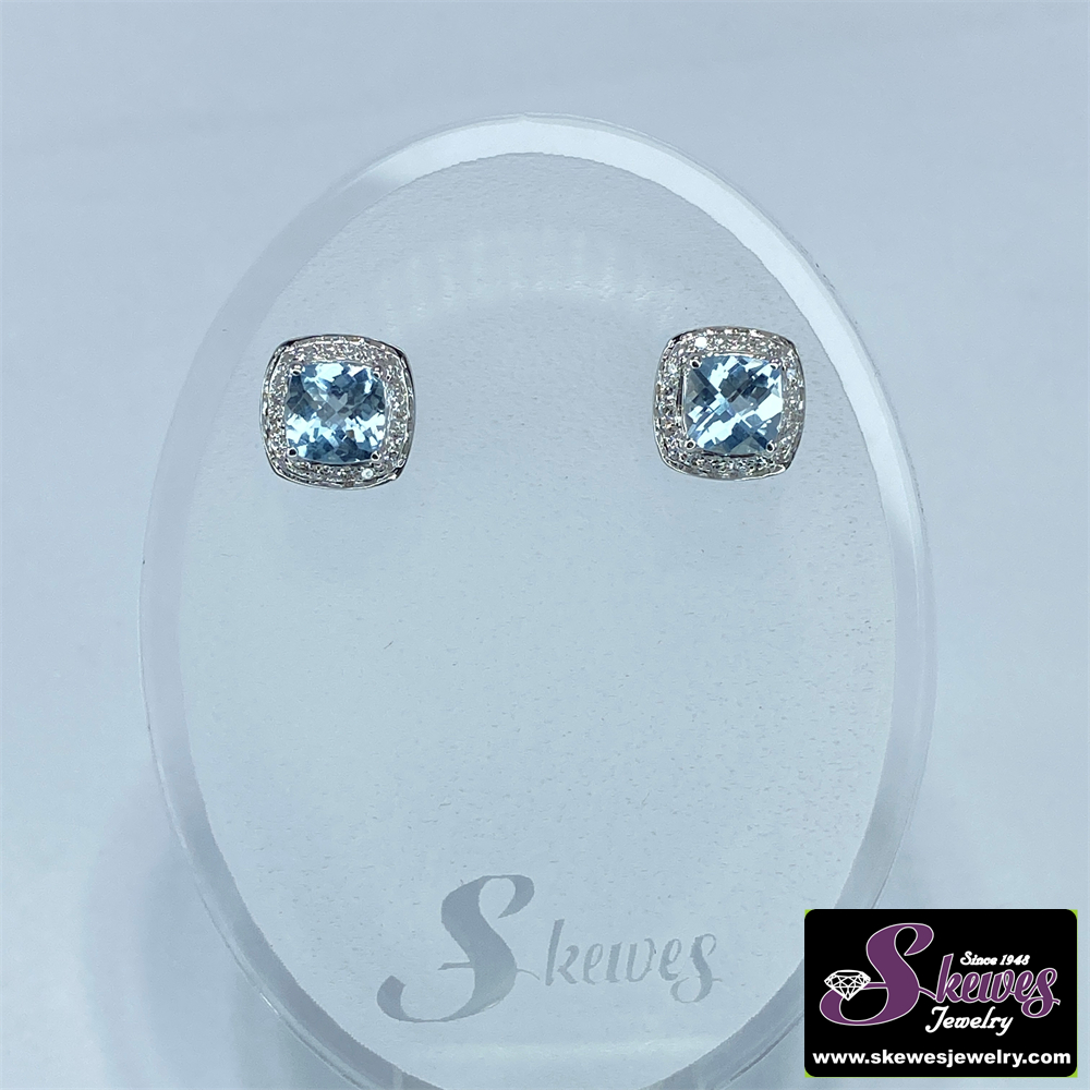 Elevate your look with these stunning 10K white gold earrings featuring a captivating aquamarine center stone and sparkling diamond accents. The perfect accessory for any occasion.
