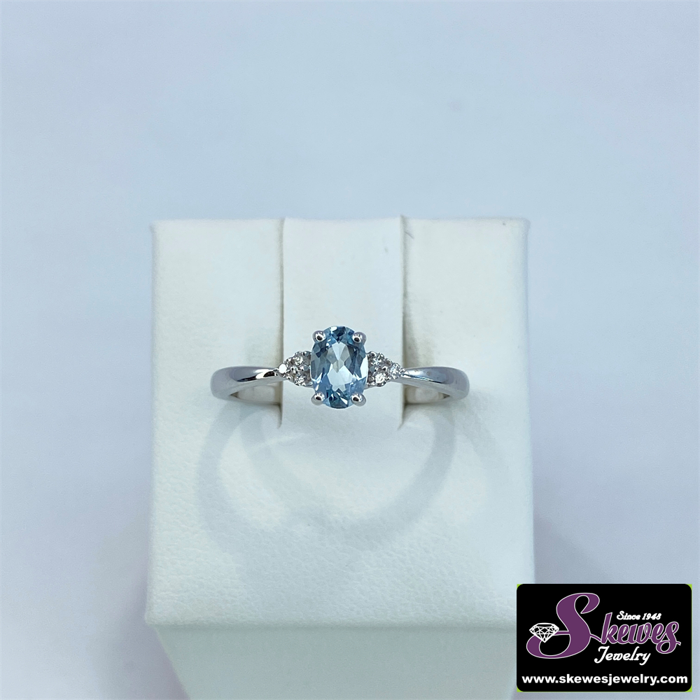 Elevate your style with this stunning 10K white gold ring featuring a captivating aquamarine center stone in an emerald cut, accented by sparkling diamonds. A timeless and elegant piece to cherish.