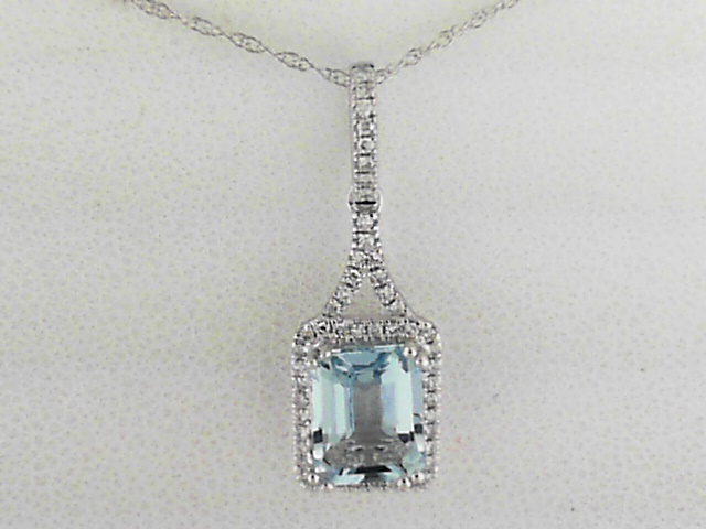 Elevate your style with this stunning 10K white gold pendant featuring a captivating aquamarine center stone and shimmering diamond accents. The perfect accessory to complement any outfit.
