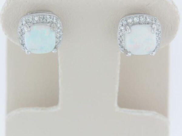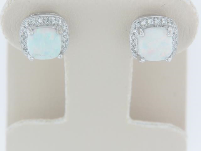 Elevate your look with these stunning 10K white gold earrings featuring a pair of captivating created opals accented with a total weight of 0.10 carats of diamonds. The perfect touch of elegance for any occasion.