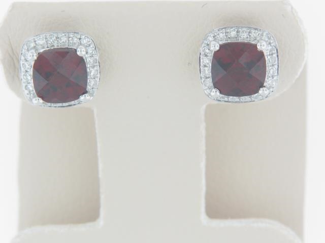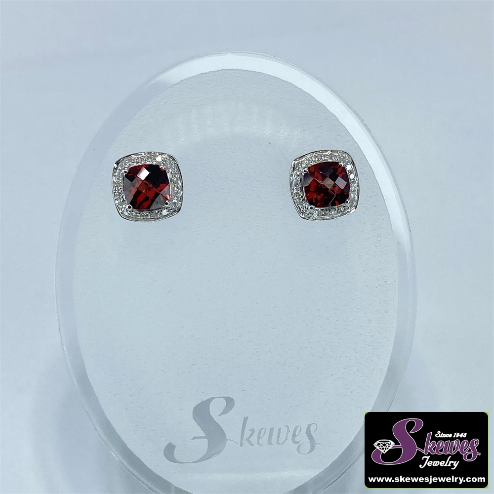 Elevate your look with these stunning 10K white gold earrings featuring a captivating garnet center stone and shimmering diamond accents. The perfect touch of elegance for any occasion.