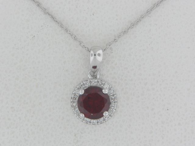 Elevate your style with this captivating 10K white gold pendant featuring a vibrant garnet center stone and sparkling diamond accents. A timeless piece that adds a touch of sophistication to any outfit.