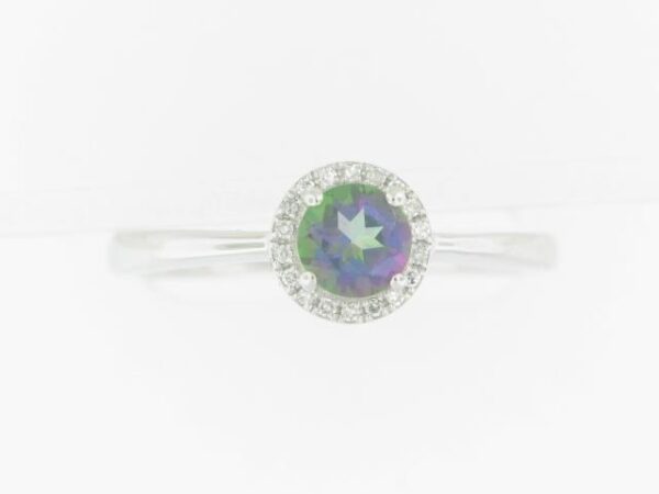 Elevate your style with this stunning 10K white gold ring featuring a mesmerizing Mystic Fire Topaz center stone and sparkling diamond accents. The perfect blend of elegance and sophistication.