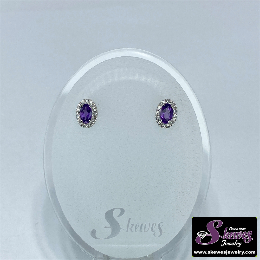 Elevate your look with these stunning 10K white gold earrings featuring a captivating oval amethyst center stone and a total weight of 0.10 carats of diamonds. The perfect accessory for any occasion.
