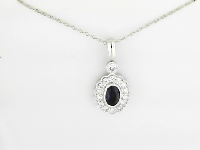 Elevate your style with this captivating 10K white gold pendant featuring an oval sapphire center stone and sparkling lab grown diamond accents. A timeless piece that adds a touch of sophistication to any look.