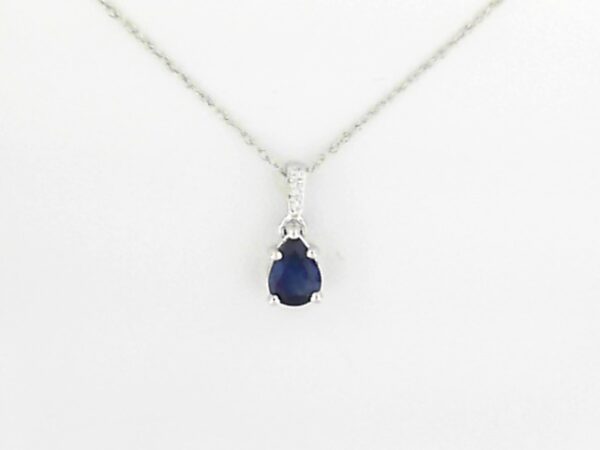 Elevate your style with this stunning 10K white gold pendant showcasing a pear-shaped sapphire center stone and sparkling diamond accents. A timeless piece that adds a touch of elegance to any outfit.
