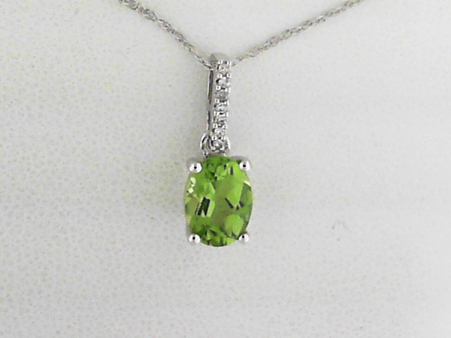 Elevate your style with this stunning 10K white gold pendant showcasing a captivating peridot center stone and delicate diamond accents. A timeless piece that adds a touch of elegance to any outfit.