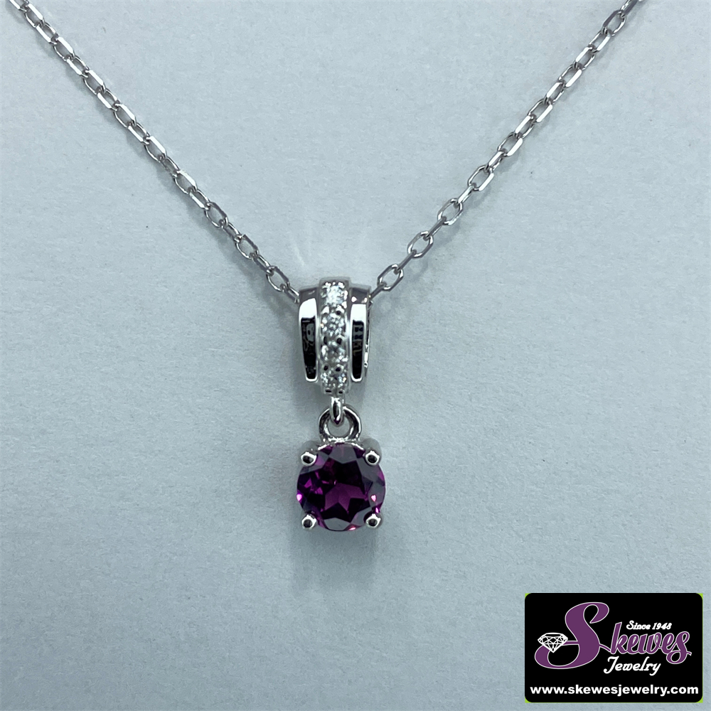 Elevate your style with this elegant 10K white gold pendant featuring a captivating round rhodolite garnet. The delicate design showcases the gemstone’s natural beauty.