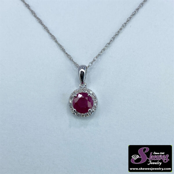 Elevate your style with this captivating 10K white gold pendant featuring a vibrant ruby center stone and shimmering diamond accents. A timeless piece that adds a touch of sophistication to any look.