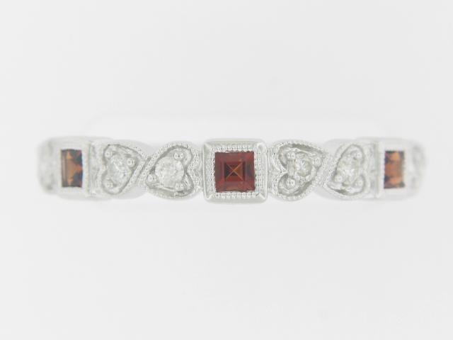 Elevate your style with this elegant 10K white gold ring featuring a captivating garnet center stone and shimmering diamond accents. Designed for stacking, this versatile piece adds a touch of sophistication to any look.