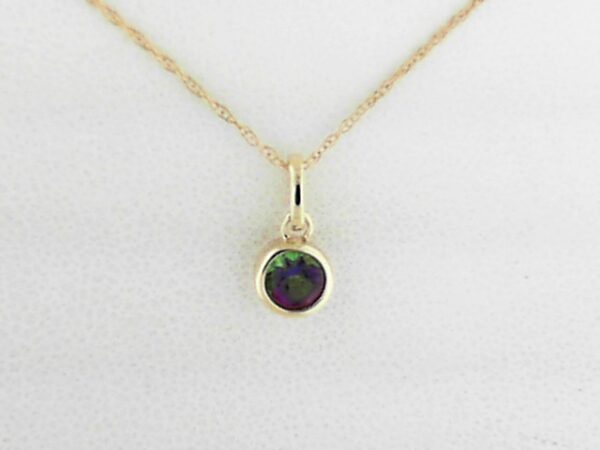 Elevate your style with this captivating 10K yellow gold pendant featuring a 4mm mystic fire topaz. The pendant’s timeless design and vibrant gemstone create a stunning focal point.