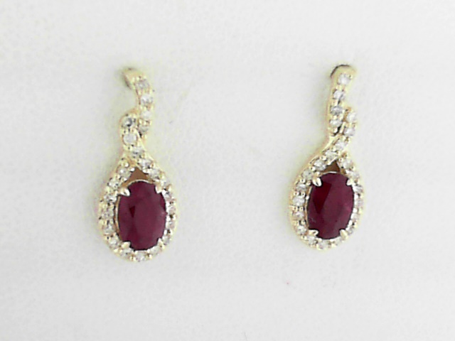 Elevate your look with these stunning 10K yellow gold earrings featuring a 6x4mm oval ruby and a total diamond weight of 0.23 carats.