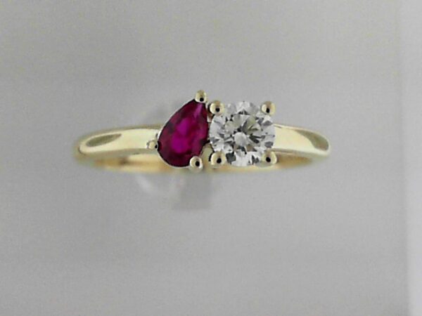 Elevate your style with this stunning 10K yellow gold ring featuring a pear-shaped lab-created ruby and round lab-grown diamond accents. The perfect blend of elegance and sparkle.