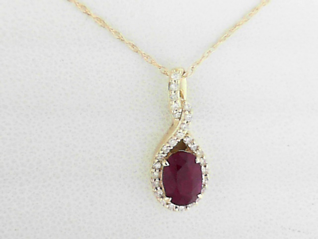 Elevate your style with this stunning 10K yellow gold pendant featuring a vibrant 7x5mm ruby center stone and sparkling diamond accents. A timeless piece that adds a touch of elegance to any outfit.