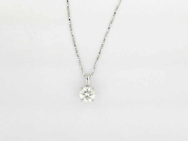 Elevate your style with this 14K white gold pendant featuring a captivating .57 carat lab grown diamond in a round brilliant cut. Suspended on an 18 box chain, this pendant is a timeless and sophisticated accessory.