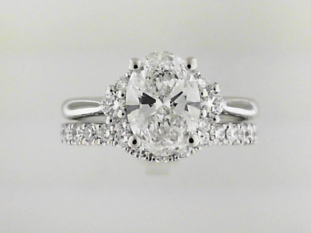 Exquisite 14K white gold semi-mount engagement ring featuring a 1.57 carat oval lab-grown diamond center with a total set weight of 2.17 carats. Includes a coordinating wedding band.