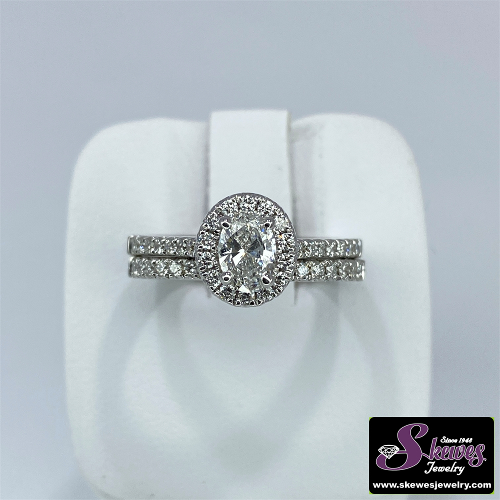 This 14K white gold semi-mount engagement ring features an oval lab grown diamond center stone. The ring can be set with your choice of compatible gemstone. Includes a matching 14K white gold wedding band.