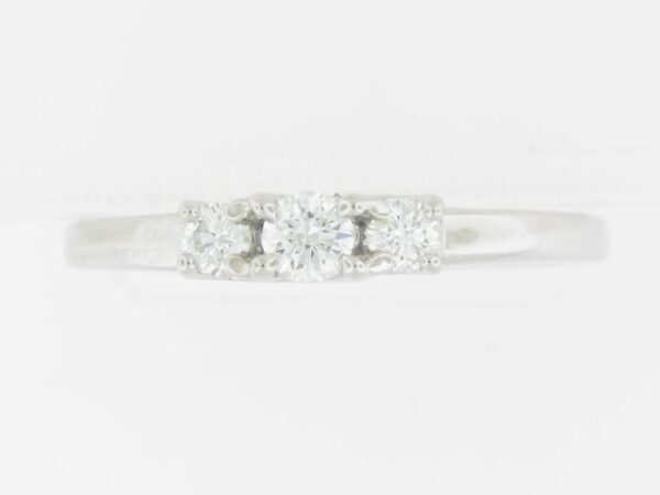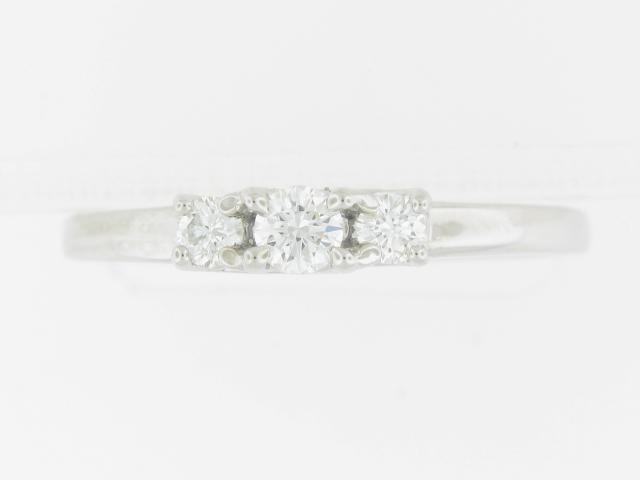 Crafted in 14K white gold, this elegant ring features three sparkling diamonds totaling 0.25 carats. The classic three-stone design is a timeless choice.