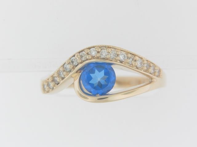 Elevate your style with this exquisite 14K yellow gold ring featuring a captivating 1/2ct Kashmire Blue topaz center stone and 0.16ct of shimmering diamond accents. The perfect balance of color and brilliance.