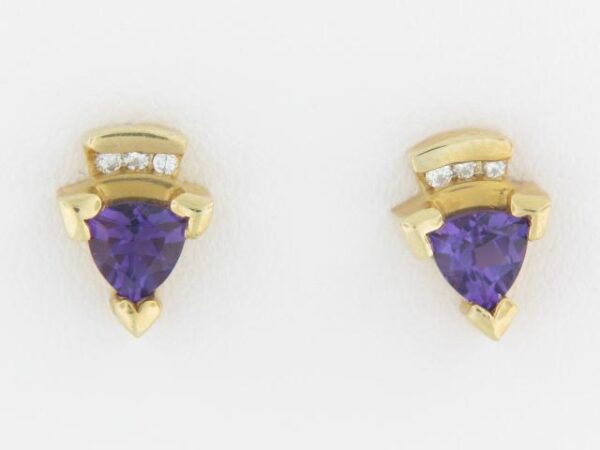 Elevate your look with these stunning 14K yellow gold earrings featuring a captivating amethyst center stone and sparkling diamond accents. The total diamond weight is .06 carats, adding a touch of brilliance.