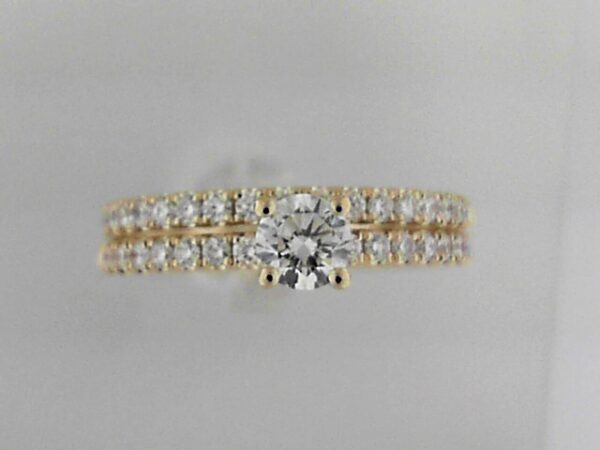 Elegant 14K yellow gold engagement ring and wedding band set featuring a lab grown diamond center stone with a total carat weight of 0.75. The perfect choice for a modern, eco-conscious bride.