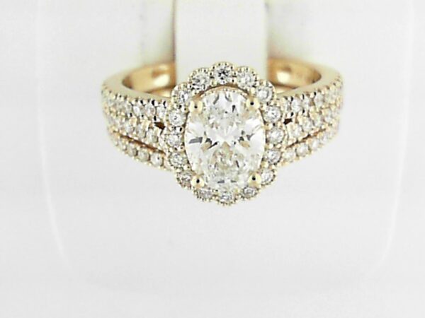 Elevate your proposal with this stunning 14K yellow gold semi-mount engagement ring featuring a 1ct oval lab grown diamond center and a matching wedding band for a total weight of 1.84ct.
