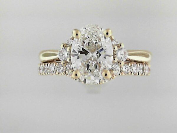 Sophisticated 14K yellow gold semi-mount engagement ring set with a 1.54 carat oval lab grown diamond center and a coordinating wedding band. The total weight of the set is 2.14 carats.