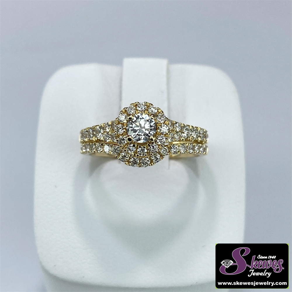 Elegant 14K yellow gold semi-mount engagement ring featuring a lab grown diamond center stone and a coordinating wedding band. Crafted for a timeless, sophisticated look.