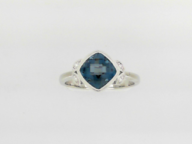 Indulge in the captivating beauty of this 14K white gold ring, featuring a stunning 1.63ct London Blue Topaz center stone and delicate diamond accents.