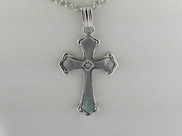 Elevate your style with this exquisite Sterling Silver pendant featuring a captivating Mother of Pearl cross design and a sparkling CZ center. A versatile accessory that adds a touch of elegance to any outfit.