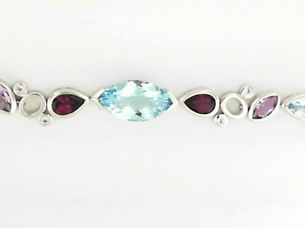Elevate your style with this exquisite Sterling Silver bracelet featuring a mesmerizing array of blue topaz, amethyst, and rhodolite gemstones. Crafted with meticulous attention to detail, this piece adds a touch of elegance to any outfit.