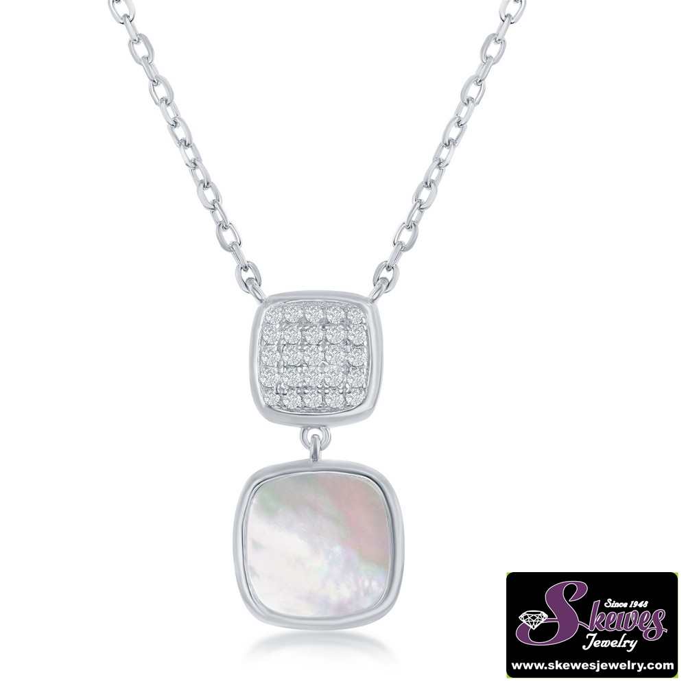 Elevate your style with this stunning Sterling Silver necklace showcasing a double square design accented with shimmering Cubic Zirconia and lustrous Mother of Pearl.
