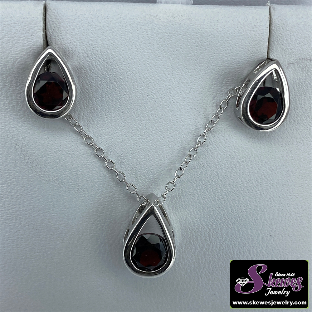Elegant Sterling Silver Pearshaped Earrings and Pendant with Round Garnet