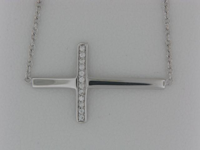 Elevate your style with this captivating Sterling Silver Sideways Cross Pendant. Adorned with sparkling Cubic Zirconias, it adds a touch of elegance to any outfit.