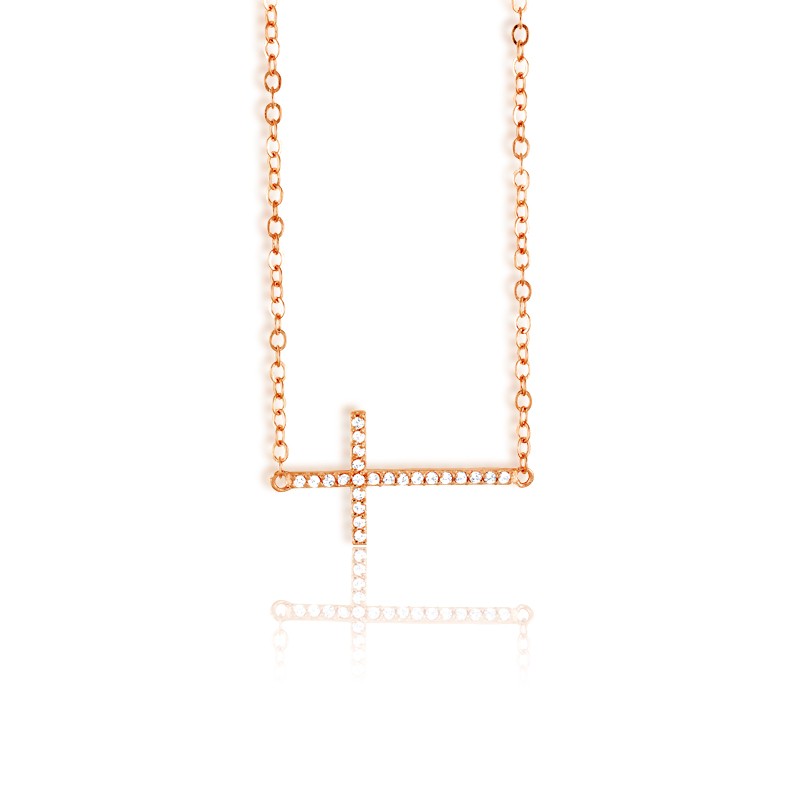 Elevate your style with this stunning Rose Gold-Plated Sterling Silver Sideways CZ Cross Necklace. The delicate cross design adds a touch of elegance to any outfit.