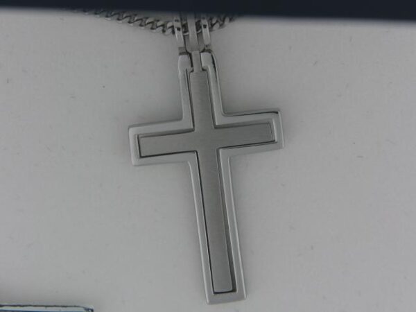 Elevate your style with this modern and versatile stainless steel cross pendant. Crafted with a sleek, two-part design, it’s a timeless accessory that complements any outfit.