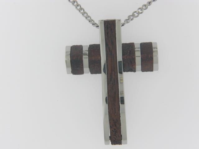 Elevate your style with this sleek Stainless Steel Cross Pendant, complemented by a 24-inch wooden chain for a modern, versatile look.