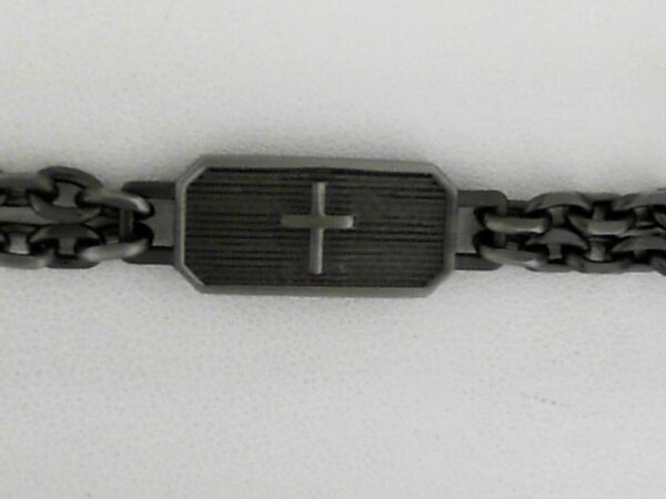 This stylish Stainless Steel bracelet features a gunmetal double chain link design with a cross ID plate. Perfect for everyday wear or casual occasions.