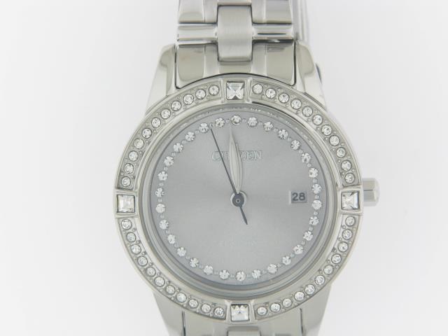Elevate your style with this stunning Citizen Eco Drive ladies watch, crafted in durable stainless steel and adorned with sparkling crystals for a touch of elegance.