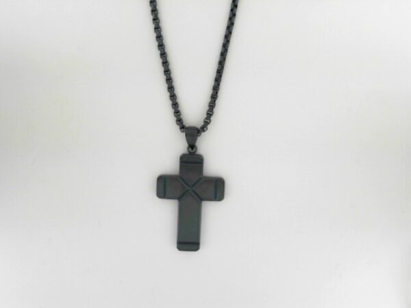 Elevate your style with this sleek Stainless Steel Ridged Cross Necklace. Featuring a Cobalt Blue accent, this necklace adds a touch of sophistication to any outfit.