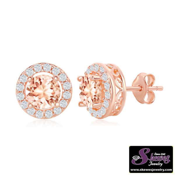 Elevate your look with these stunning Sterling Silver and Rose Gold Plated Morganite CZ Stud Earrings. The Morganite CZ center is beautifully framed by a border of White CZ stones for a captivating sparkle.