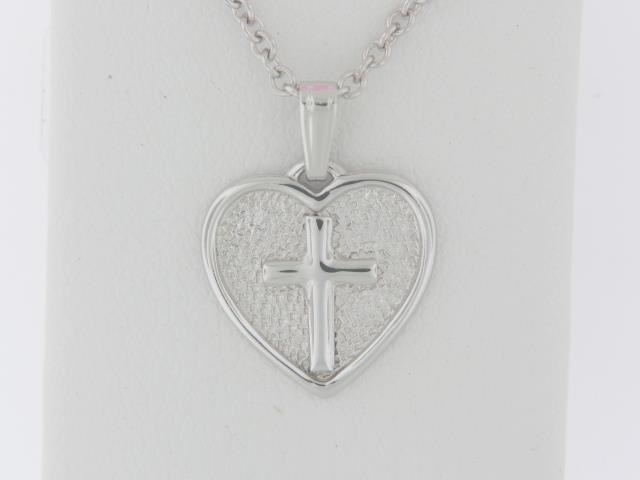 Crafted in gleaming Sterling Silver, this captivating pendant features a heart and cross design, perfect for children to wear and cherish.