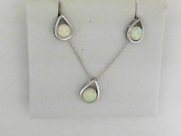Elevate your style with this stunning sterling silver earrings and pendant set, featuring a pear-shaped design and a round created opal center. Crafted with meticulous attention to detail, this set is a captivating addition to any jewelry collection.