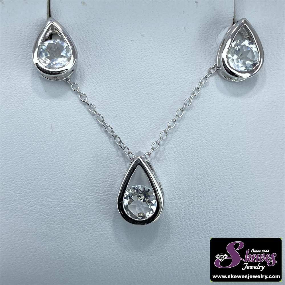 Elevate your style with this stunning set featuring a pair of pear-shaped sterling silver earrings and a matching pendant, both adorned with round white topaz stones.