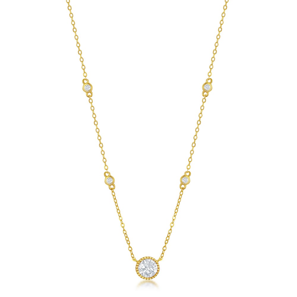 Elevate your style with this stunning Sterling Silver necklace featuring a delicate chain adorned with round Cubic Zirconia stations in a gleaming gold-plated finish.