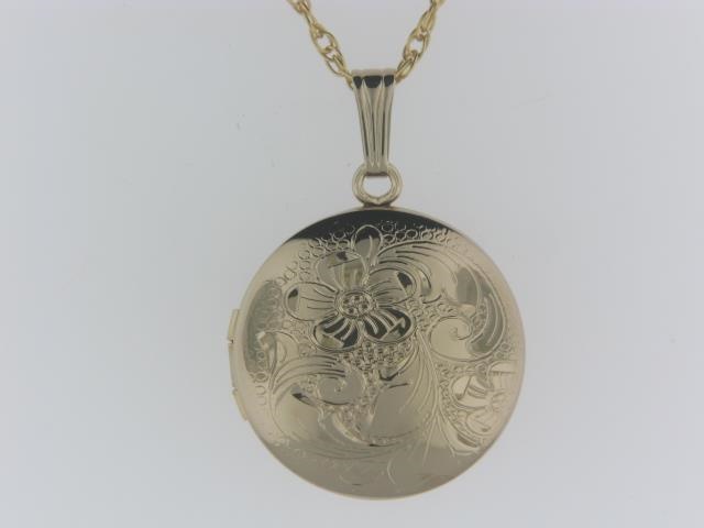 Indulge in the timeless elegance of this gold filled locket, meticulously hand-engraved with a stunning round silhouette for a truly remarkable piece.