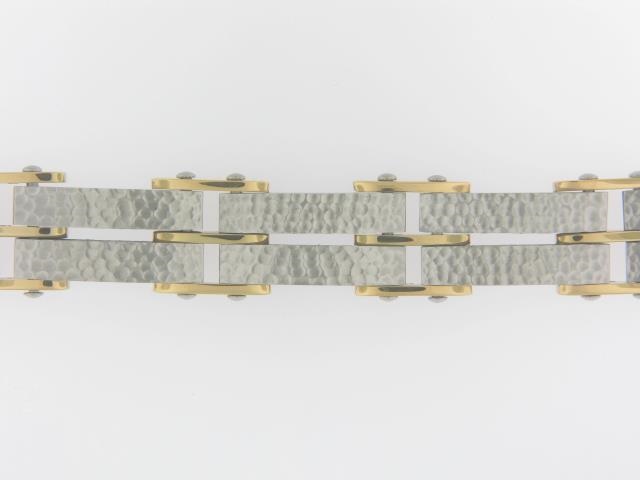 Elevate your style with this modern, two-tone stainless steel bracelet featuring a hammered texture and a self-adjustable 8 1/4 inch length.